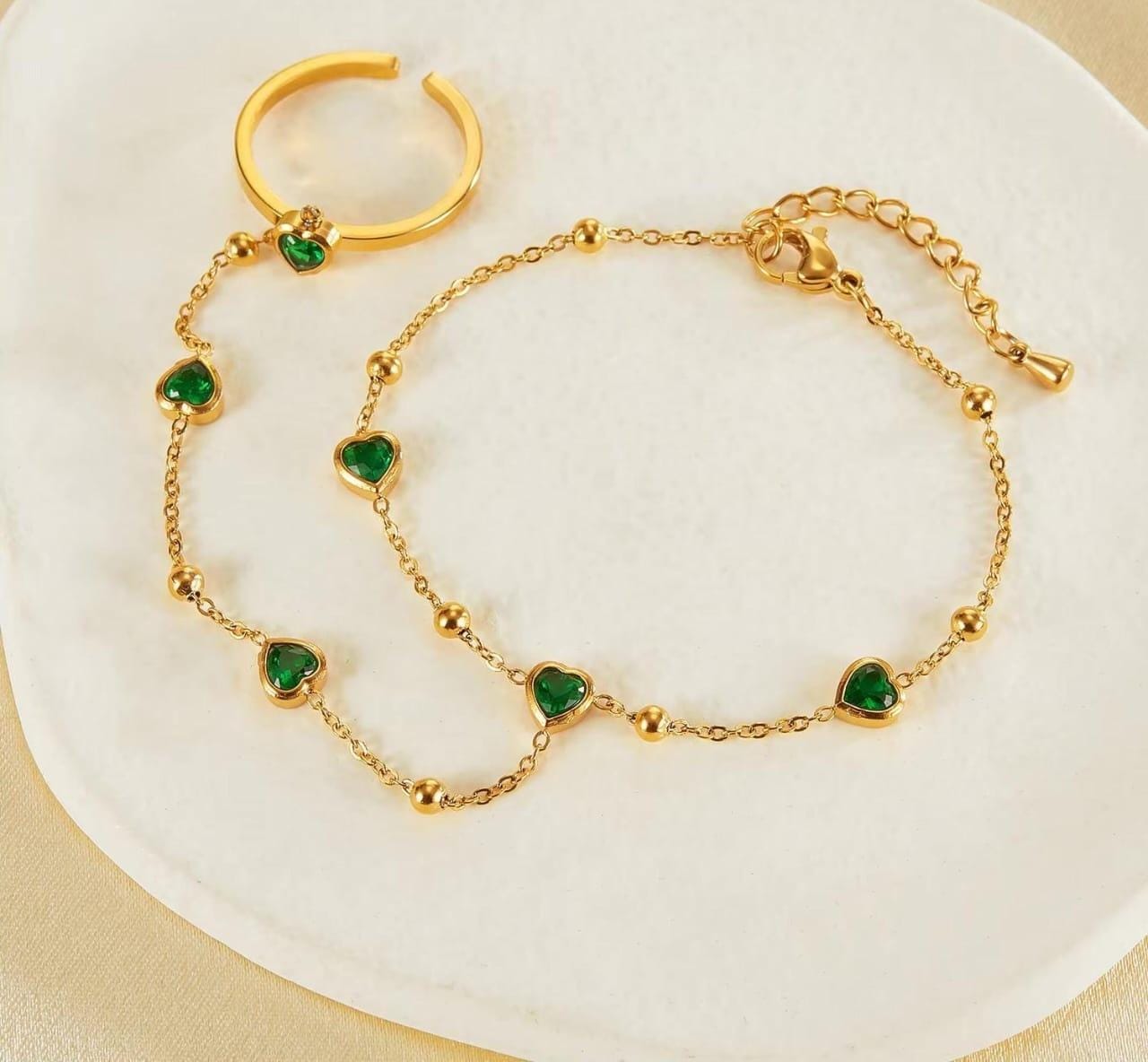 Indulge in timeless royalty with our Green Stone Anja, exclusively at Nur-e-Niqab. This exquisite piece features a vibrant emerald-green stone that captures the essence of luxury and grace. “Anja” symbolizes favor, and this stone-encrusted design is sure to become your favorite accessory for special occasions. Wrapped in a polished stainless steel border, the deep green hue stands out beautifully against any skin tone. Whether you’re styling it with a formal silk hijab or a modern evening outfit, this anti-tarnish green stone jewelry ensures you carry an air of sophistication wherever you go.